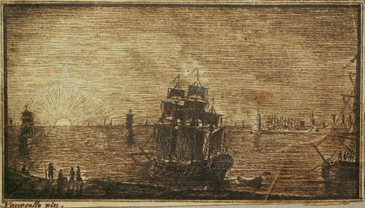 Antique Etching - "(Coastal scene with sailing ship and setting sun over the sea)". |