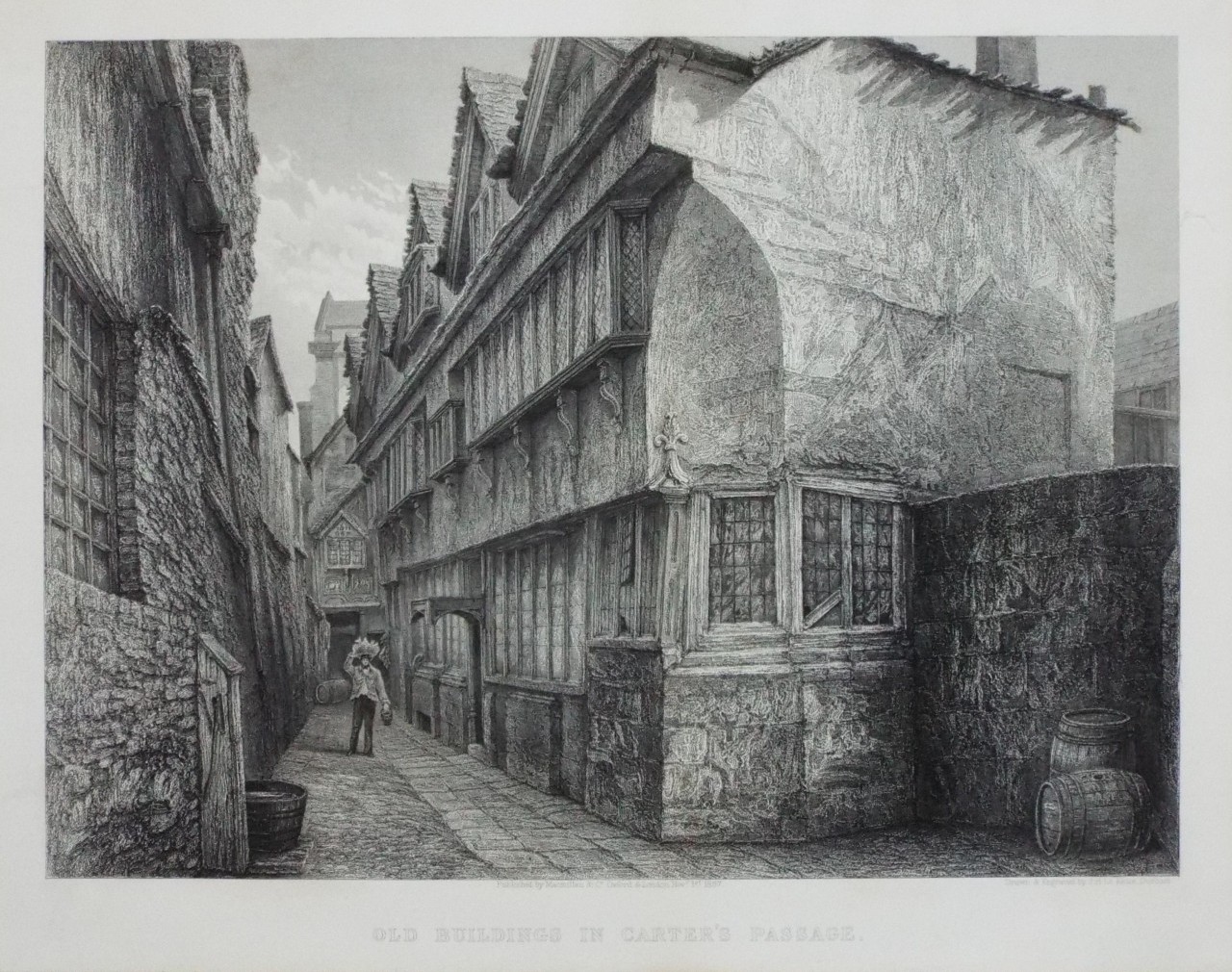 Antique Print - "Old Buildings in Carter's Passage." by Keux J H Le published 1868 by McMillan & Co, Oxford.