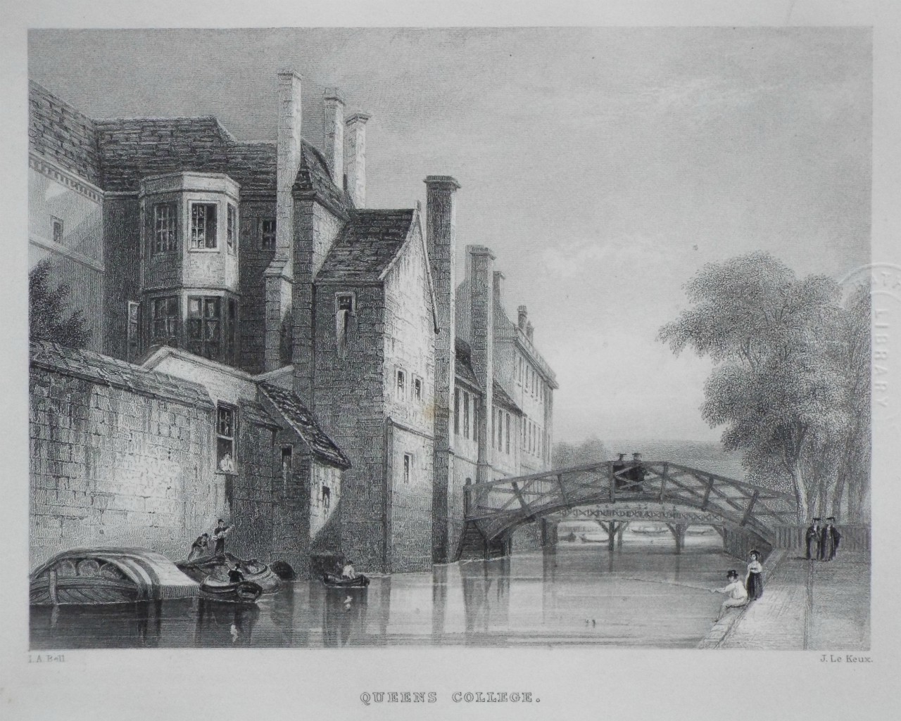 Antique Print - "Queens College." by Keux J Le after I A Bell published 1860.