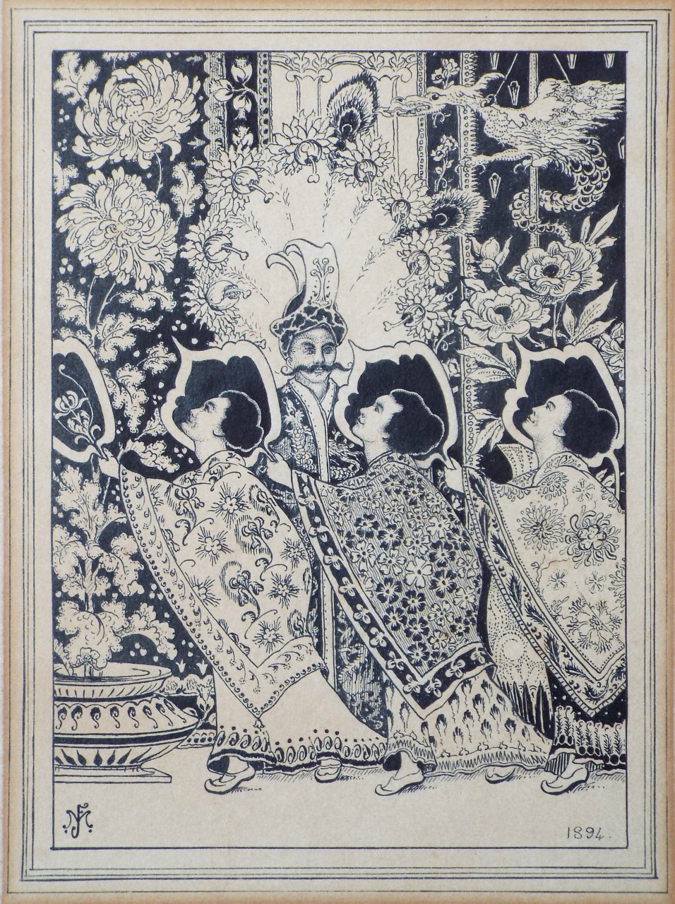| A scene from "The Mikado" by Gilbert and Sullivan. Aesthetic movement illustration, with artist's monogram FJM (?). |