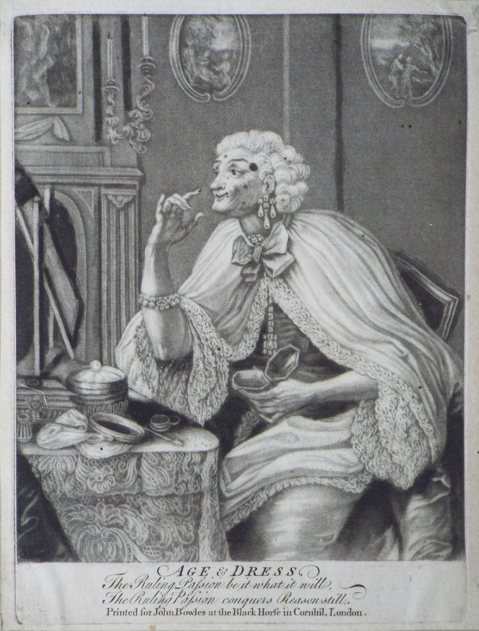 Antique Mezzotint - "Age & Dress. The Ruling Passion be it what it will, The Ruling Passion conquers Reason still." published by John Bowles at the Black Horse in Cornhil, London.. |