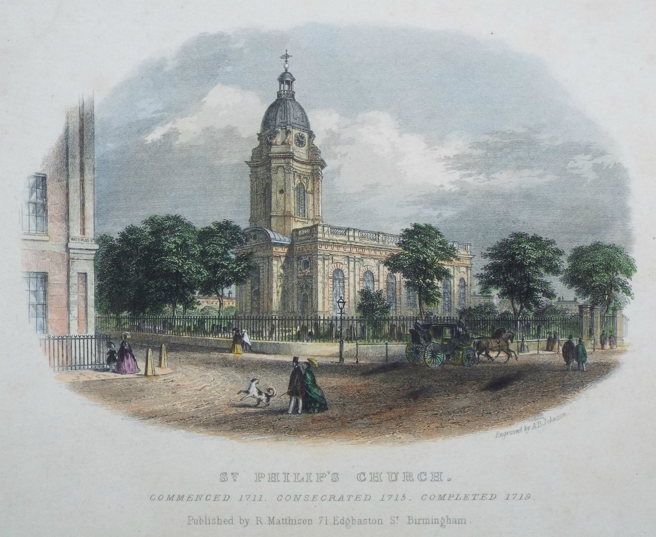 Antique Steel Vignette - "St. Philip's Church. Commenced 1711. Consecrated 1715. Completed 1719." by A B Johnson published by R. Matthison 71,Edgbaston St. Birmingham.