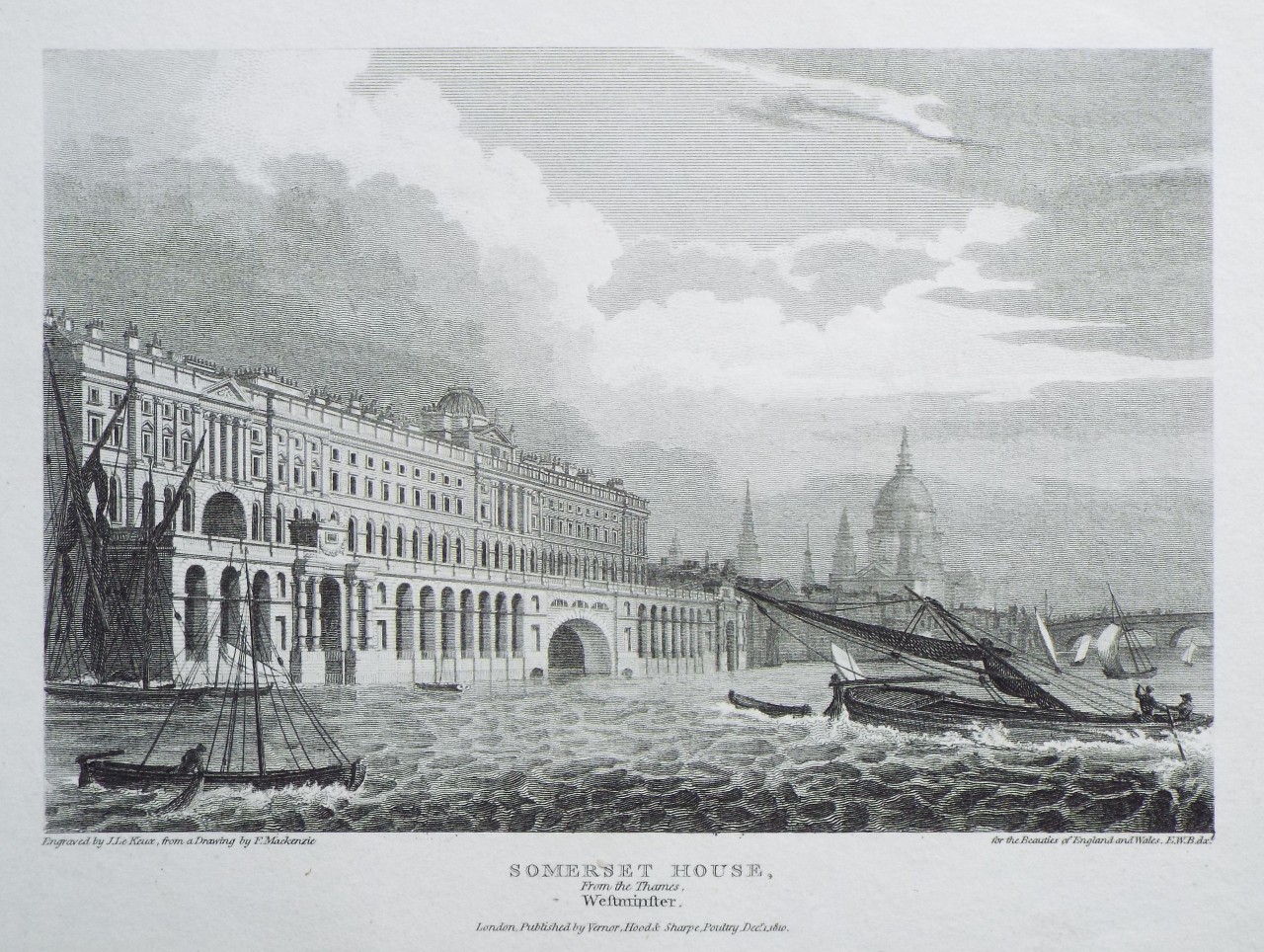 Antique Print - "Somerset House, from the Thames, Westminster." by Keux J Le after F Mackenzie published 1810 by Vernor, Hood & Sharpe, Poultry.