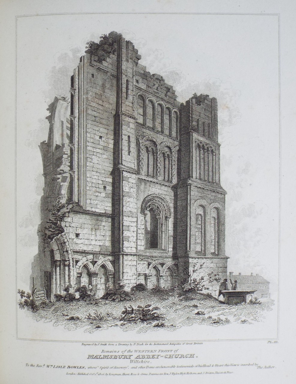 Antique Print - "Remains of the Western Front of Malmsbury Abbey-Church, Wiltshire." by J Smith after F Nash published 1806 by Longman & Co, Paternoster Row.