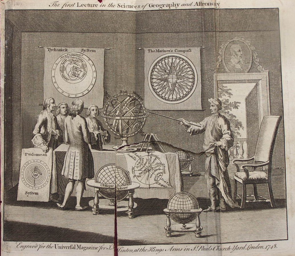 Antique Print - "The First Lecture in the Sciences of Geography and Astronomy" published 1748 by J. Hinton. |
