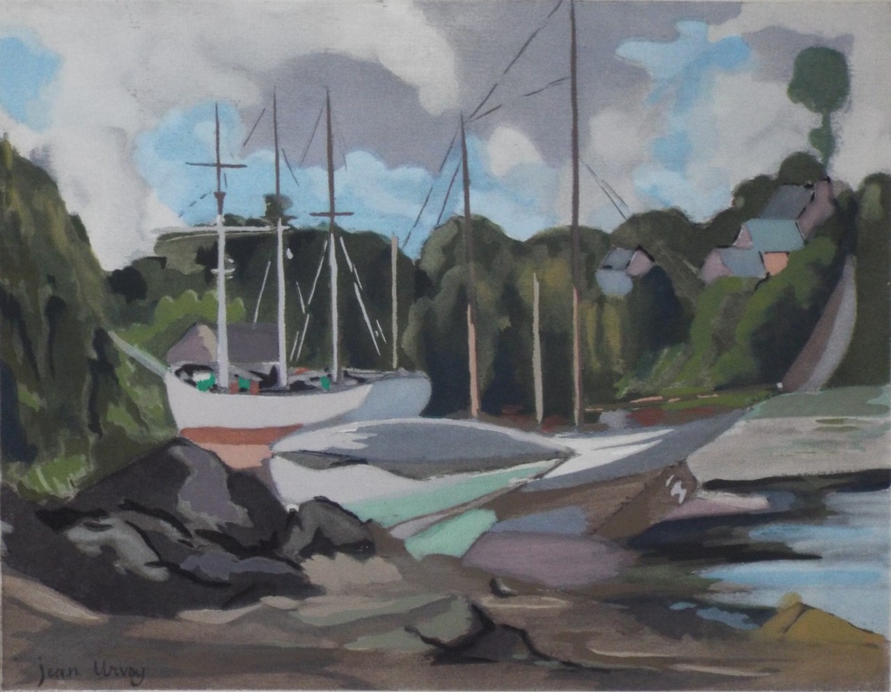 Antique Pochoir Gouache - "Barques a la Landriais" after J Urvoy. |