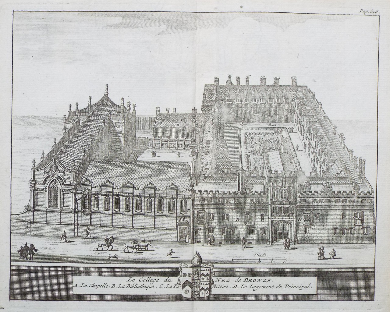 Antique Print - "Le College de Nez de Bronze." after D Loggan published 1727 by Pieter Van der Aa.