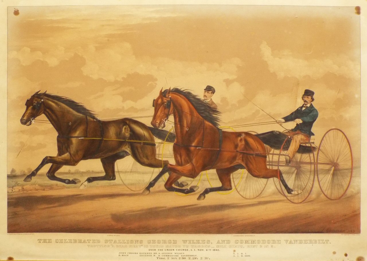 | The Celebrated Stallions George Wilkes, and Commodore Vanderbilt. Trotting Dead Heat in their Match to Wagons Mile Heats Best 3 in 3, over the Union Course L. I. Nov 6th 1865. Ref: P/16487 Categories: Sporting / Racing Medium: Lithograph