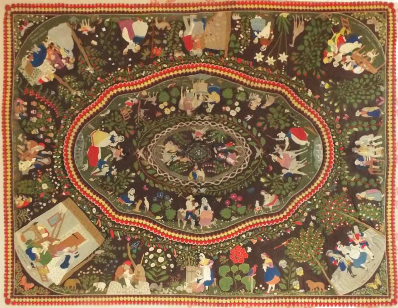 The quilt is large enough to cover a small double bed. The design is based upon three concentric ovals, each containing a series of vignettes with captions. Many of these are paired with another image in the same oval.