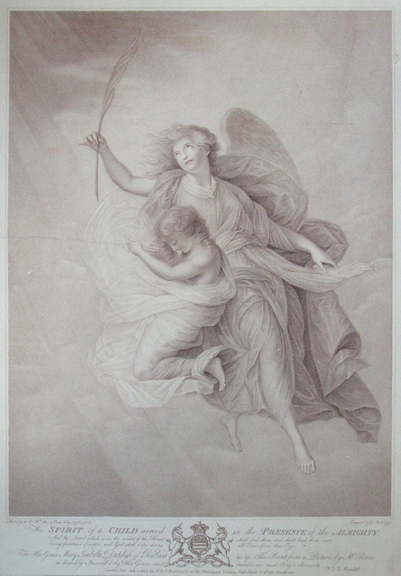 | The Spirit of a Child arriv'd in the Presence of the Almighty. And the Lamb which is in the midst of the Throne shall feed them and shall lead them unto living fountains of waters, and God shall wipe away all Tears from their Eyes. To Her Grace Mary Isabella... Ref: P/11151 Artist: Peters, William Engraver: Bartolozzi, Francesco Publisher: Boydell J & J Date: 1801