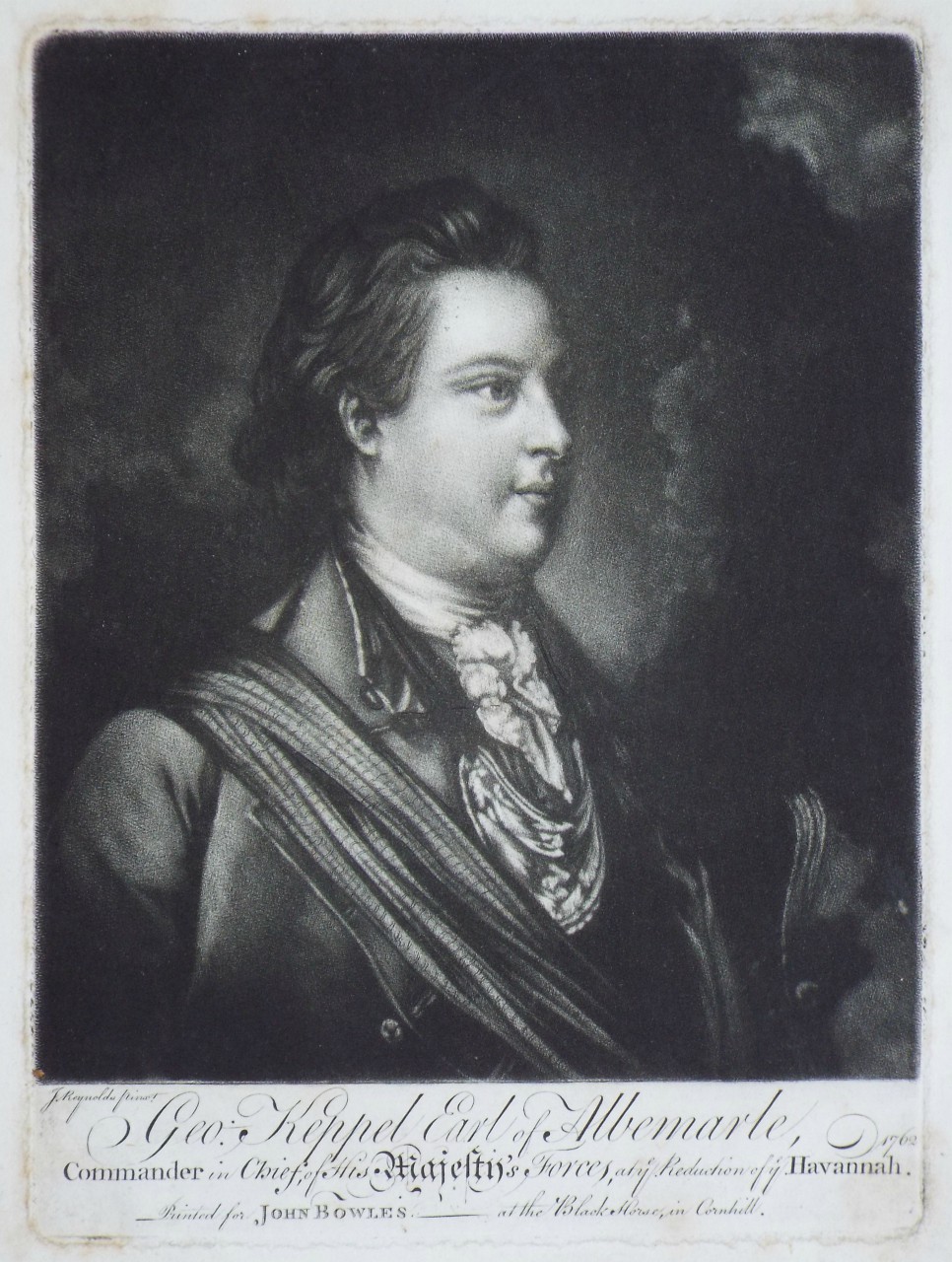 Antique Mezzotint - "Geo: Keppel Earl of Albemarle, Commander in Chief of His Majesty's Forces, at ye Reduction of ye Hannah. 1762" after J Reynolds published by John Bowles, at the Black Horse, in Cornhill. |