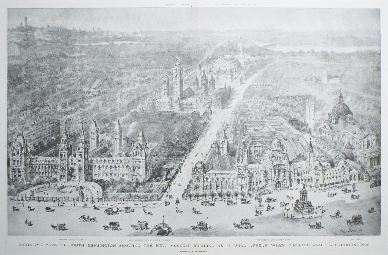 Antique Lithograph - "Bird's Eye View of South Kensington, showing the new Museum Building as it will will appear when Finished and its Surroundings." after H W Brewer published 1899. |