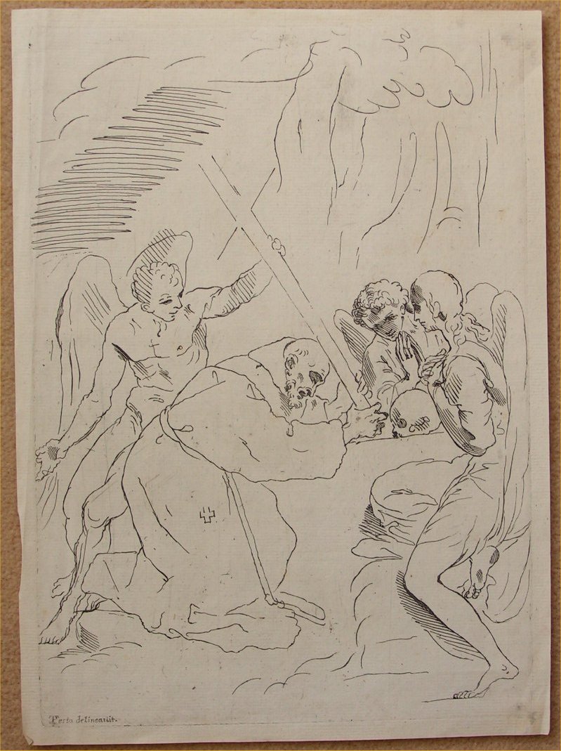 Antique Etching - "(Saint, cross, tomb, angels)" by P Testa. |