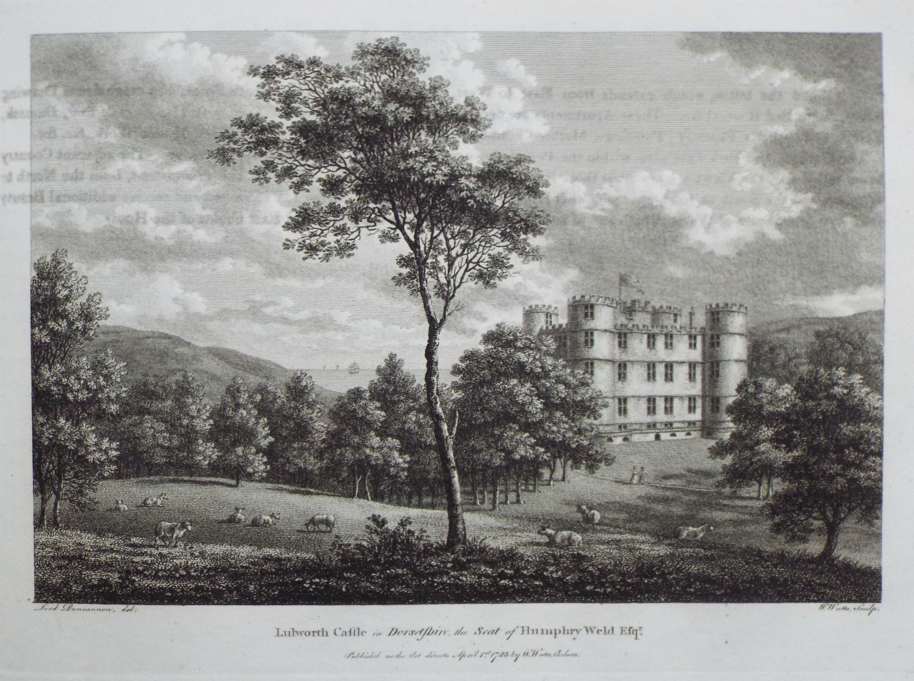 Antique Print - "Lulworth Castle in Dorsetshire, the Seat of Humphry Weld." by W Watts after Lord Duncannon published 1785 by W Watts, Chelsea.