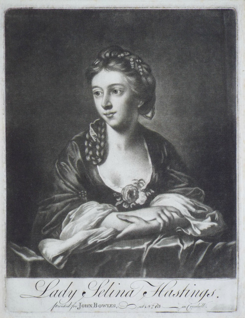 Antique Mezzotint - "Lady Selina Hastings." after J Reynolds published by John Bowles, at No. 13 in Cornhill.
