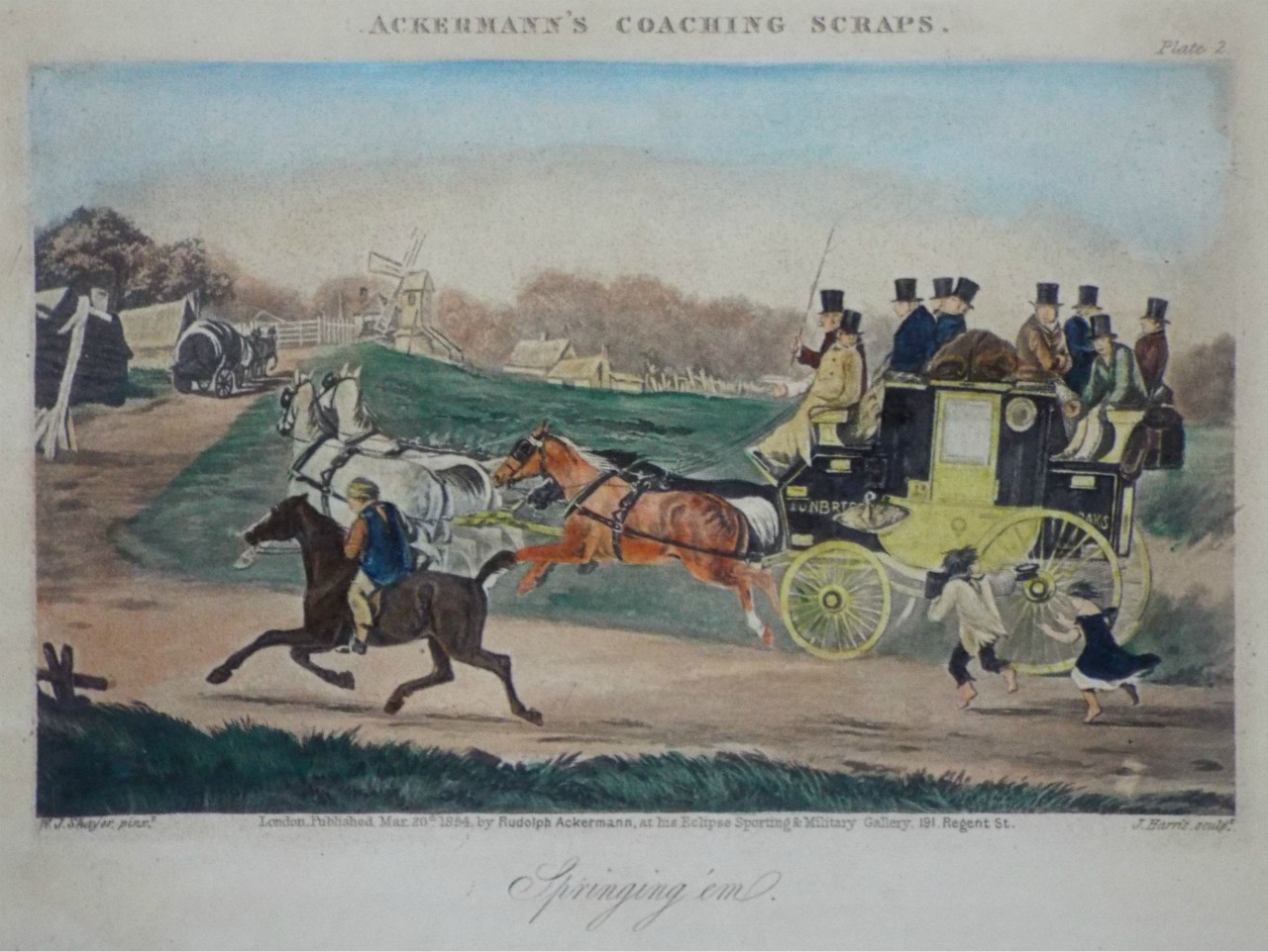 Antique Aquatint - "Ackermann's Coaching Scraps. Plate 2. Springing 'em." by J Harris after W J Shayer published 1854 by Rudolph Ackermann, at his Eclipse Sporting & Military Gallery 191 Regent St..