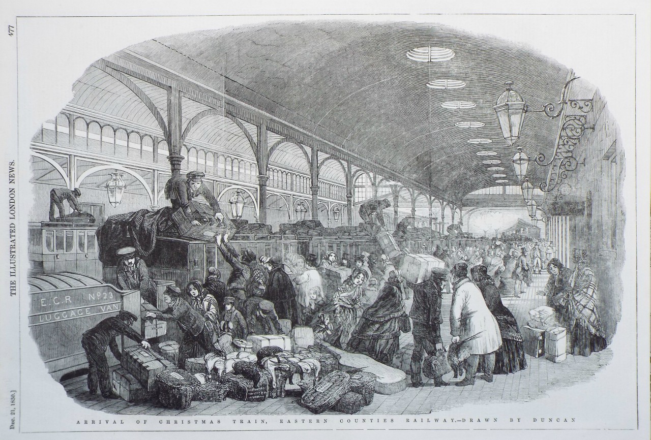 Antique Wood - "Arrival of Christmas Train, Eastern Counties Railway Station" published 1850.