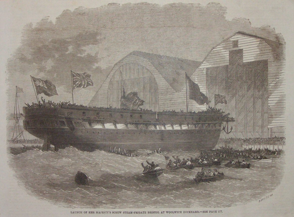 Launch of Her Majesty's Screw Steam-Frigate Bristol at Woolwich Dockyard.