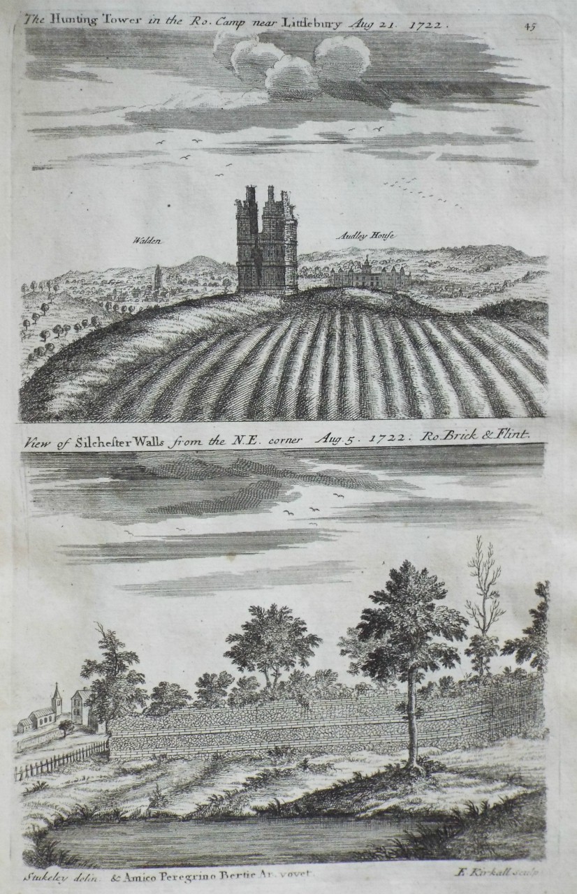 The Hunting Tower in the Ro. Camp near Littlebury View of Silchester Walls from the N.E. corner Aug. 5. 1722. Ro. Brick & Flint.